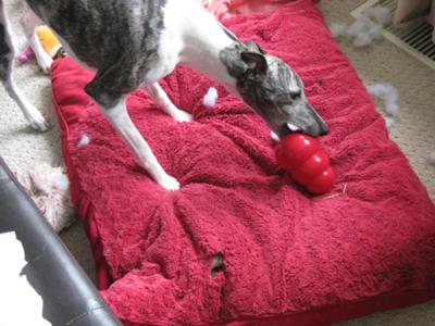 Sure enough, I watched her jump up onto my very high bed, stand at the edge and drop her kong off the side, sending dog food flying all over my floor. My clever girl realized that she needed more force to loosen the rest of the food.